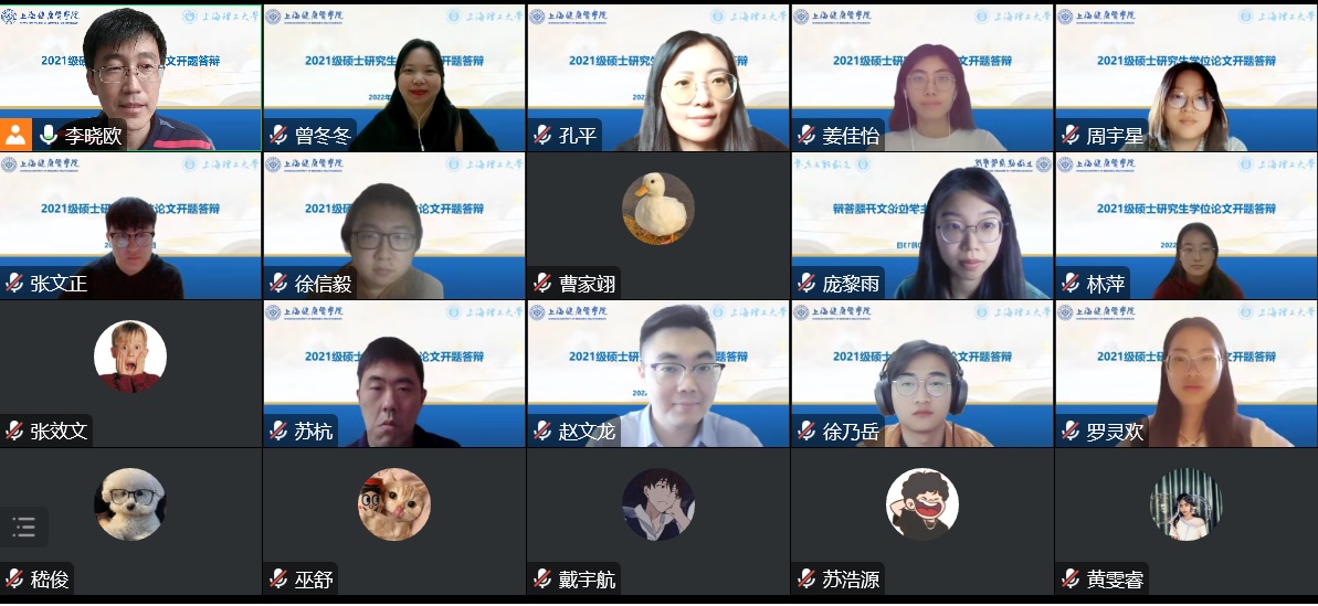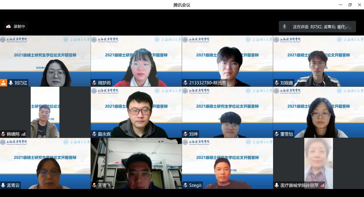 10月13日,医疗器械学院举办2021级上海理工大学联合培养硕士研究生开题答辩会。开题作为研究生培养的关键环节,对研究生日后的学习、科研训练与学位论文撰写起着至关重要的作用。本次报告会采用线上模式,共分为3组,邀请上海市精神卫生中心苏杭副研究员、上海市医疗器械检验研究院王伟高级工程师、上海对外经贸大学戴永辉副教授和12位研究生导师共同担任评委,其他年级硕士研究生观摩学习。