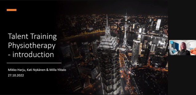 本研究项目于北京时间2022年10月27日17点进行了开班仪式,为了让双方更好地沟通交流,本次会议也是配备了同声传译。开班仪式中,上海健康医学院国际交流处处长薛文隽对双方的领导进行了介绍,希望此次研修班能够顺利开展,中方的教师以及康复治疗师能学到更多的知识。康复学院郭琪院长对芬兰的领导表示热烈的欢迎,提到了康复专业的开设是配合“健康中国”2030规划纲要的需要,学校要培养既懂技术,又懂管理的应用型人才。同时,郭琪也对研修班的学员寄予了美好的愿望。