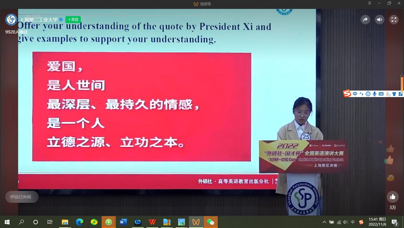 本届“外研社·国才杯”全国大学生英语演讲比赛激烈,在校赛中杨孟婷同学力压学校近200名参赛选手脱颖而出,以身边之事感受中国智慧,从亲历中国铁路变迁的角度讲述了中国高铁技术的发展。在指导教师的建议下,她成功地在演讲中描绘了金山铁路悄无声息地为百姓包括她的生活带来的便利,体现了中国铁路真正以民为本、与民方便的高科技的厚度与温度。她的演讲质朴坚实,用最真实的语言反映了中国智慧的科技之力、亲和之力,实属难得的佳作。尤其在即兴演讲环节,杨孟婷同学从全球视野的视角出发,完美地解答了爱国是人世间最深层、最持久的情感,也是一个人的立德之源、立根之本。在与复旦大学、同济大学、上海交通大学等二十多所高校学子的激烈比拼中,她沉着冷静、应对从容,表现出以题为端、以赛为径,初心如炬、使命如磐的健康人风采。