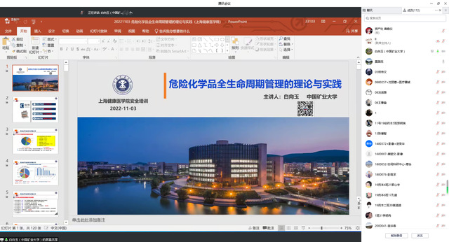 作为教育部实验室安全检查专家的上海交通大学实验室安全与环保中心副主任彭华松博士、中国矿业大学环境实验中心主任白向玉教授,为我校师生奉上了精彩的实验室安全盛宴。各二级学院(部、中心)实验室安全负责人、实验室管理员、相关职能部门负责人师生代表400余人参加了此次系列培训。培训由资产处副处长曾光英主持。