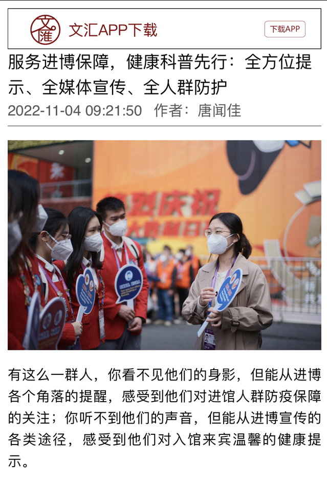从工作内容和辐射范围来说,爱国卫生与健康促进岗的工作是比较繁琐的。每一位小叶子都需要带着敏锐的目光去发现进博会场馆内所有对疫情防控造成影响的行为,并及时制止。虽然工作辛苦,但在岗期间看到经过我们的劝导后,访客们都能自觉正确佩戴口罩、掐灭烟头,带给我们团队满满的成就感。