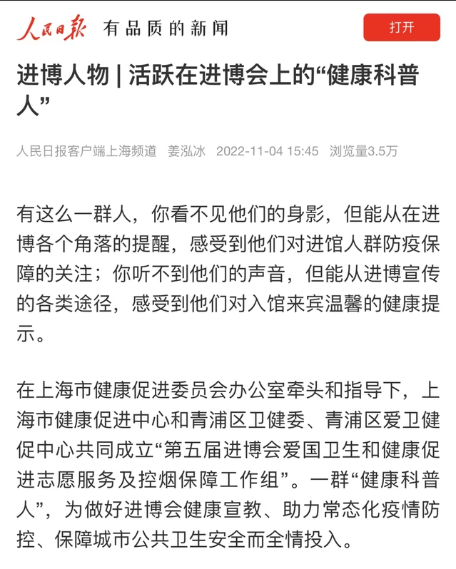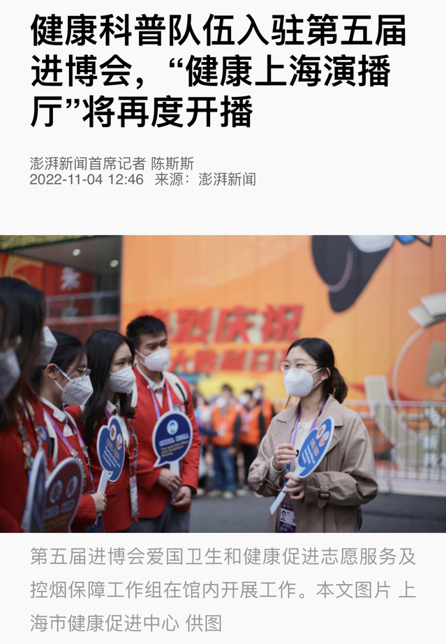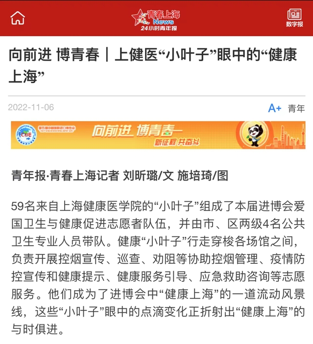 截至11月10日,据统计:爱国卫生与健康促进岗中,小叶子们累计进行控烟劝阻3000余次,健康折页宣教500余次。医疗展区接待引导贵宾30余批,服务参展人员过百名,向医疗展区全部176个参展商提供本次展会的会刊。在体验官及储备岗中,累计完成推送10篇,视频投稿6篇。“健康小叶子”们的志愿服务事迹先后得到了人民日报、文汇网、澎湃新闻、青年报·青春上海等多家主流媒体报道15篇,累计获5万+的点击量,在上海乃至全国产生了广泛影响。