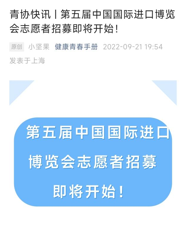 9月21日,上海健康医学院第五届中国国际进口博览会志愿者招募开始。