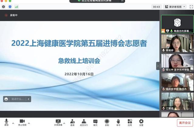 10月16日,上海健康医学院第五届中国国际进口博览会志愿者应急救护培训会如期举行,本次培训会特邀请到我校优秀毕业生、现就职于上海市急救中心的陶晟吉学长为我校100名进博会志愿者详细讲解了心肺复苏术的操作、包扎操作、伤情评估等知识,并结合进博会场馆情况、往年服务情况,为“健康小叶子”们开展了针对性的急救培训。