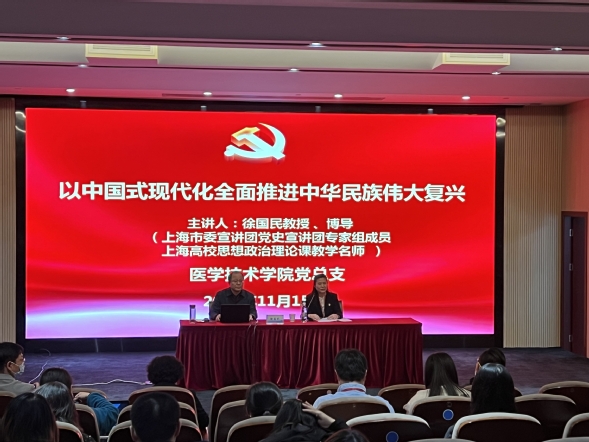 2022年11月15日,医学技术学院在北苑1号楼200报告厅开展了党的二十大精神专题学习。学院中心组成员、全体教师、学生代表参加学习。报告会由党总支书记、院长刘敏娟主持。华东理工大学马克思主义学院副院长、教授、博士生导师,上海市委宣讲团党史宣讲团专家组成员,上海高校思想政治理论课教学名师徐国民应邀作专题辅导报告。