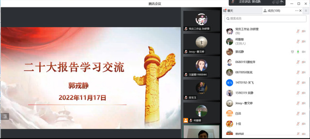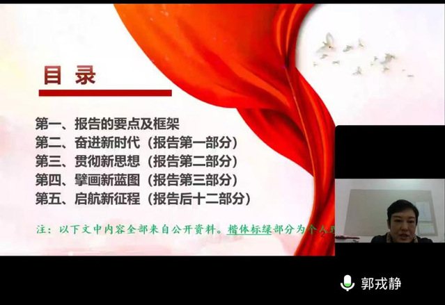 郭戎静首先分析了“报告的要点及框架”,深刻认识大会召开的意义与主题。然后分别以“奋进新时代”“贯彻新思想”“擘画新蓝图”“启航新征程”四个方面详细导读,分享学习感悟。她指出,党的二十大报告总揽全局、气势恢宏,思想深邃、内涵丰富,通篇贯穿坚定的信念追求、强烈的使命担当,更是推动中国特色社会主义不断前进的政治宣言、理论纲领和行动指南。