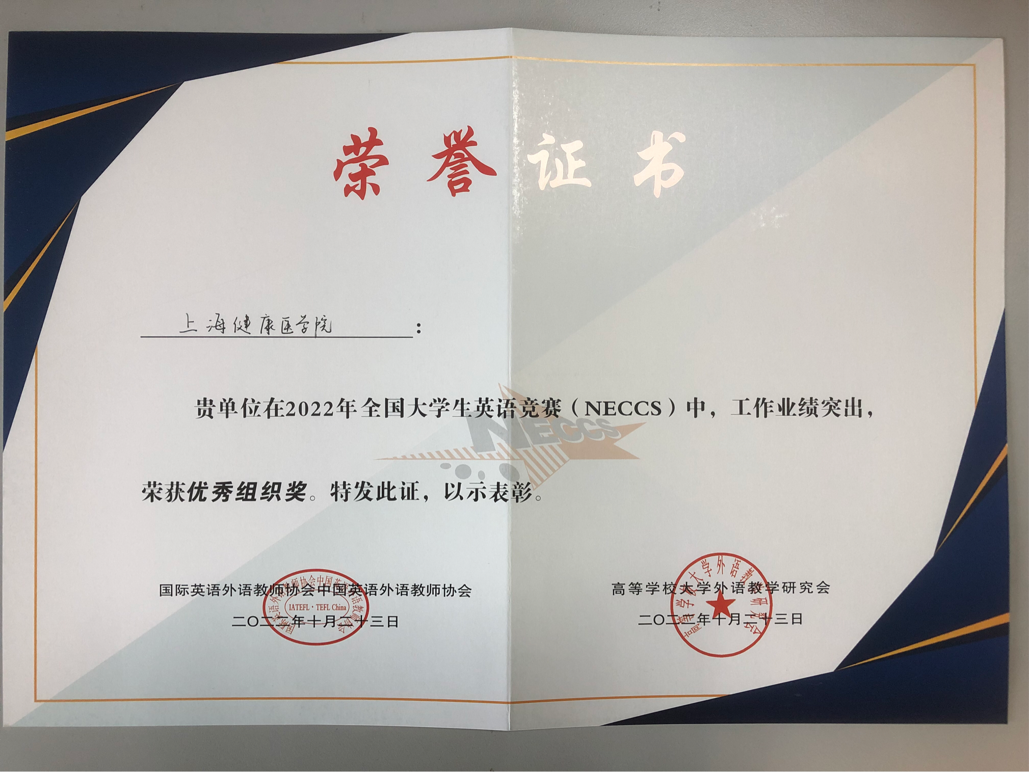 近日,我校组织学生参加了教育部高教司批准举办的全国大学生英语竞赛。该赛事为目前全国唯一的综合性国家级英语竞赛,仅上海就有包括上海交大、华师大、上外在内的40所高校参加了本届竞赛。经过初赛和决赛两轮角逐,我校临床医学院王嘉阅、杨毅、盛欣玥;护理与健康管理学院苗彭恺、华裔洁;医学技术学院顾怡蕾、顾芸菲;康复学院周颖仪、薛奕蕾;药学院李哲等10位同学获本科组全国一等奖,药学院计妍同学获高职组全国一等奖。我校另有55位同学分别获本科组及高职组全国二等奖;92位同学分获本科组及高职组全国三等奖。上海健康医学院获优秀组织奖。尽管由于疫情原因,本届大赛延期至下半年举办,大赛仍吸引了我校1840名本科及高职学生报名参赛,参赛选手覆盖全部学院及专业,参赛人数和参赛率在上海高校中名列前茅。在教务处的指导下,外语教学部有序组织并通过线上、线下等方式全程指导学生参加了这项大学生英语综合能力竞赛,全体教师分工合作,圆满完成了赛事筹备及相关培训指导工作。