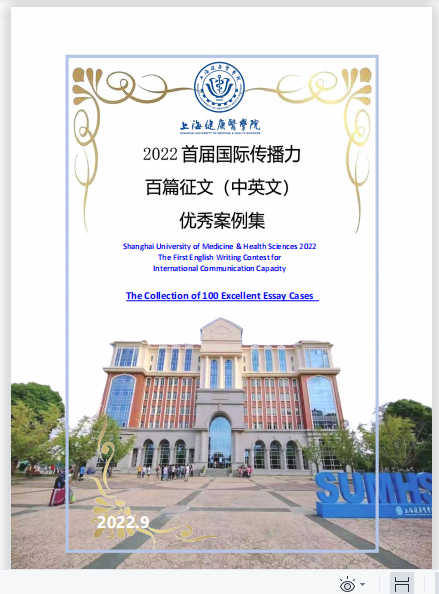 在教务处的指导下,由外语教学部承办的我校首届2022年上海健康医学院首届国际传播力征文大赛历经四个月的赛前筹备、征文比赛等环节,共收到来自全校学生的有效作品112件,经校内外专家评审和提出意见、建议,评选出短视频优秀文稿、主题英语演讲优秀文稿、大学生跨文化能力优秀文案、读报与国际传播能力大赛优秀评论文稿共计102件,作品已集结成小论文手册集,成为学科建设中将专业习得与语言学习融合的新亮点,为我校学生今后参加高层次的校内外相关赛事提供有益借鉴。