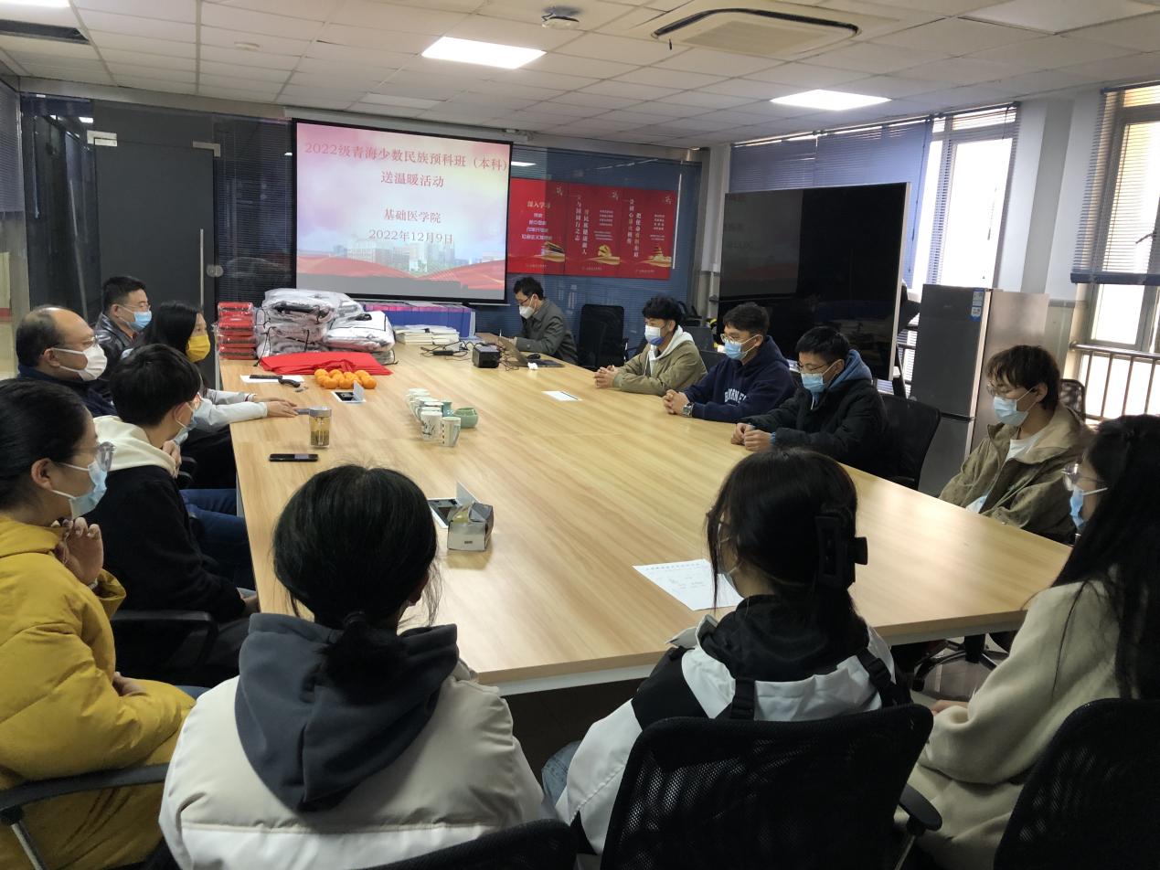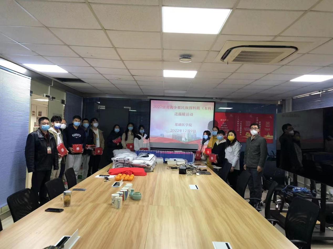 12月9日下午,基础医学院在600会议室举行2022级青海少数民族预科(本科)班送温暖活动。学院院长杨智昉、直属党支部书记程伟为预科班同学送上防疫包、毛毯等物品,表达对同学们的关心和慰问。党员教师李志宏、冯昌道等一起参加了活动。