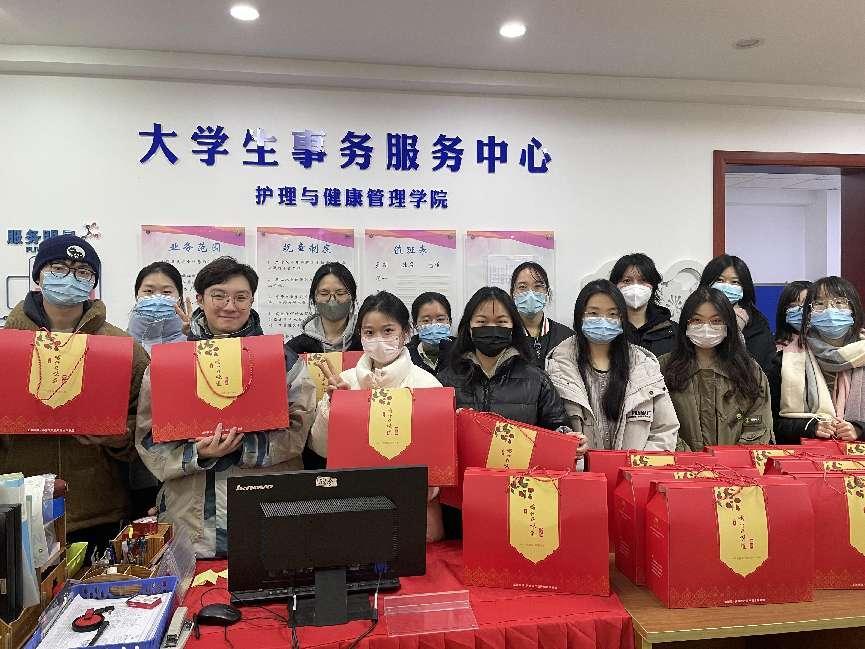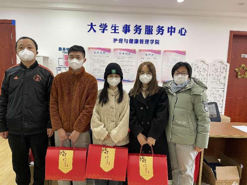 临近春节,健康校园也洋溢着节日的喜庆气氛。1月19日,护理与健康管理学院给留校学生送上新春祝福和新年大礼包,辅导员丁可凡老师和郭利军老师参加了此次慰问活动。此次留校学生中大多数都是实习学生,根据学校疫情防控工作要求,学院从12月中旬开始了线上实习,部分护理与健康管理学院的学生主动联系学院带教老师和实习单位,要求继续线下实习,与实习单位一起共渡疫情难关。