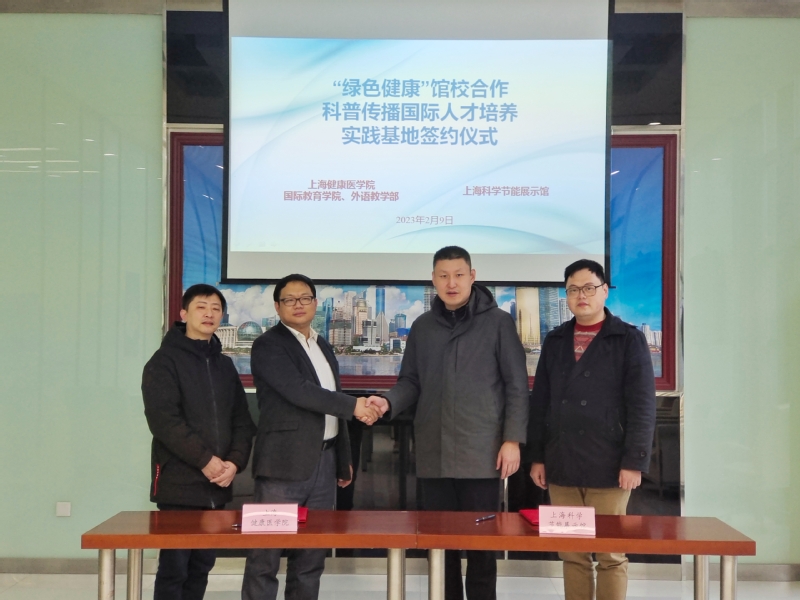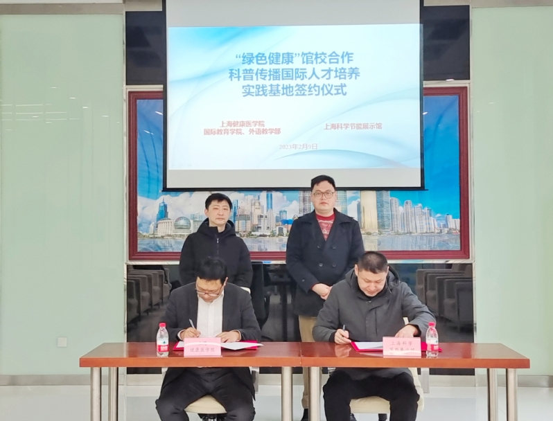2023年2月9日,由上海健康医学院国际教育学院、外语教学部牵手与上海科学节能展示馆合作的“绿色健康”馆校合作科普传播国际人才培养实践基地签约仪式在上海科学节能展示馆正式由外语教学部沈军副主任带队与陶然副馆长完成了现场签约工作,上海市虹口区科学技术协会相关人员出席并见证签约仪式。