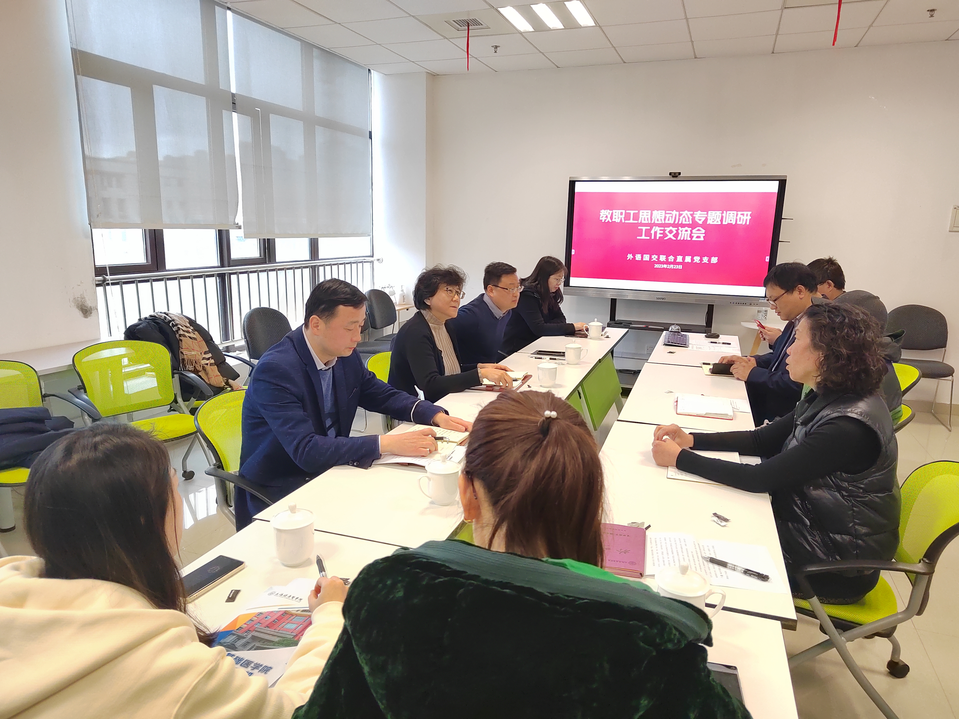 2月23日上午,校党委副书记于莹带队到外语教学部开展2023年春季开学教师思想动态专题调研。党委宣传部部长、教师工作部部长李兆伟,教务处副处长、教师工作部副部长蒋淑敏,人事处副处长、教师工作部副部长金亮等参加。教学部主任薛文隽、直属党支部书记吕永红及教师代表与会,李兆伟主持会议。