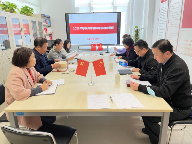 根据《关于做好2023年春季开学教职工思想动态调研等相关工作的通知》要求,金东英从“开学第一课”专题教育、教师思想动态、教师政治理论学习三方面进行汇报,并表示马院将结合党的二十大精神“三进”和本科教学工作合格评估等工作,不断提升教师素养,把立德树人任务落细落实。在座谈交流环节,就学院教职工关心的生活方面和运行方面等问题展开讨论交流。