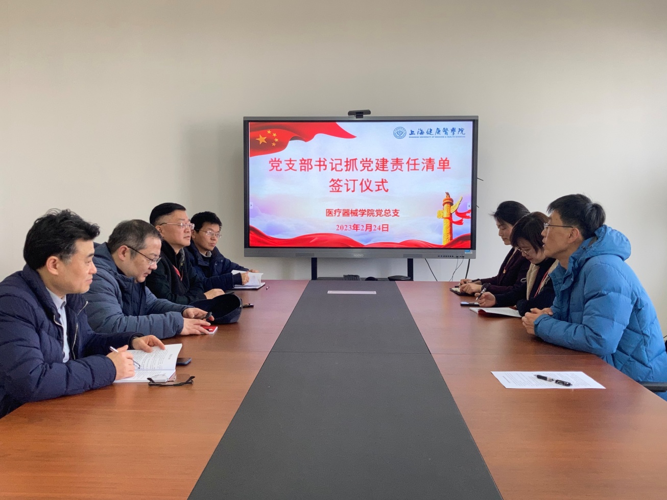 2月24日中午,医疗器械学院党总支在新南苑18号楼506室举行党支部书记2023年度抓基层党建工作责任清单签订仪式,学院党总支李晓欧书记、学院6位党支部书记以及学院党建员参加了签订仪式。