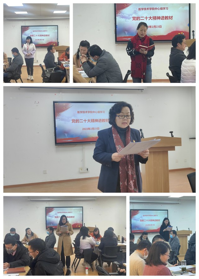 为全面贯彻习近平新时代中国特色社会主义思想,落实立德树人根本任务,医学技术学院于2月23日在4507开展题为“党的二十大精神进教材”的中心组学习。本次学习由学院党总支书记、院长刘敏娟主持,中心组全体成员出席。
