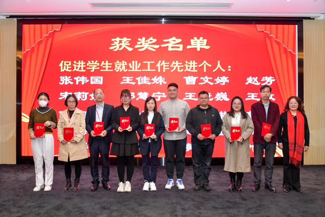 郭永瑾为2022年就业工作先进个人和促进学生就业先进个人颁发了荣誉证书,为护理与健康管理学院、临床医学院、康复学院颁发了2022年就业工作先进集体奖杯。