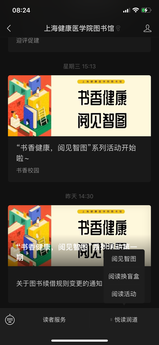 1、关注“上海健康医学院图书馆”公众号,点击菜单底部“悦读润道——阅读活动”,进入活动市场;