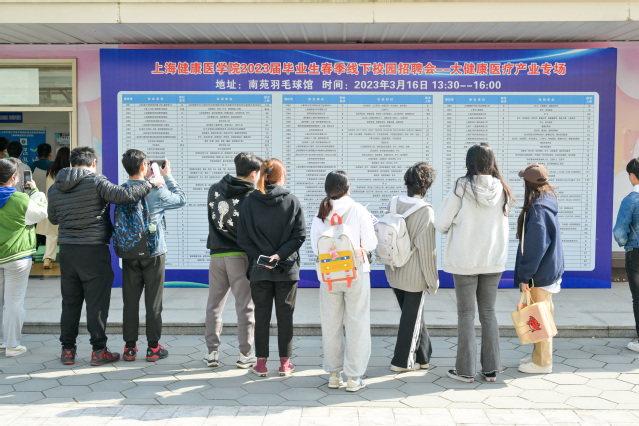 为全面贯彻落实党的二十大精神,实施就业优先战略,强化就业优先政策,抓住春季招聘关键期,3月16日下午,上海健康医学院2023届毕业生春季校园招聘会大健康医疗产业专场在南苑羽毛球馆顺利举行。此次招聘会首次开启线上线下招聘双通道,共吸引了130家企事业单位来校布展招聘;同时为提高岗位集中供给,现场同步开辟线上招聘专区,共有125家全国医疗卫生单位和大健康产业相关企业线上参加。