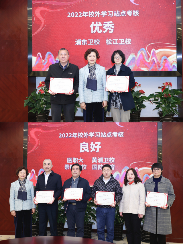 会上表彰了2022年度上海健康医学院高等学历继续教育校外教学点年度考核优秀以及良好的单位,唐红梅代表学校向这些先进单位分别颁发荣誉证书。