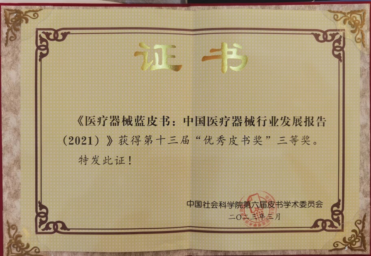 医疗器械蓝皮书获得第十三届全国优秀皮书奖三等奖