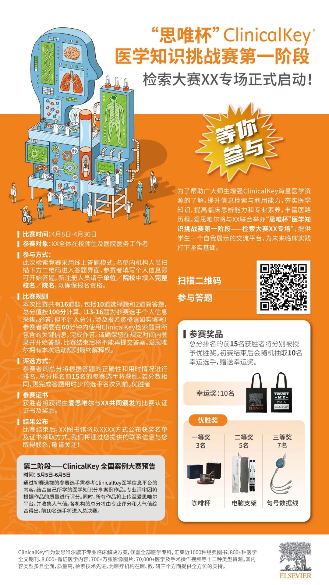 为了帮助广大师生增强ClinicalKey海量医学资源的了解,提升信息检索与利用能力,夯实医学知识,提高临床思辨能力和专业素养,丰富医路历程。爱思唯尔将与XX联合举办“思唯杯”ClinicalKey医学知识挑战赛第一阶段—— 检索大赛上海健康医学院专场”,提供学生一个自我展示的交流平台,为未来临床实践打下坚实基础。