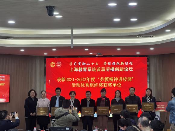 上海教育工会副主席陶文捷介绍了教育系统“劳模创新工作室”的建设情况。会议表彰了教育系统40家2021-2022年度“劳模精神进校园”活动优秀组织奖单位并颁发了奖牌。我校工会常务副主席凌文惠代表学校领奖。