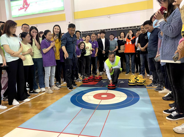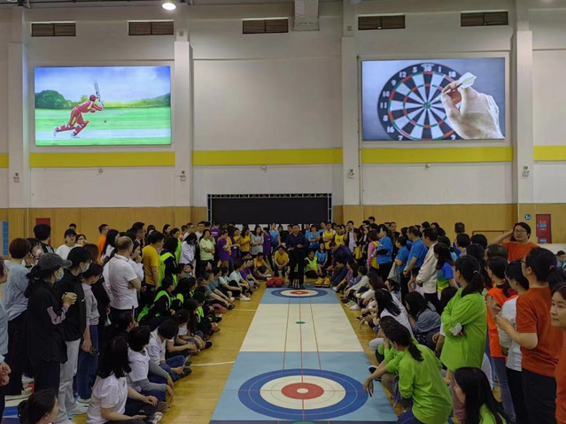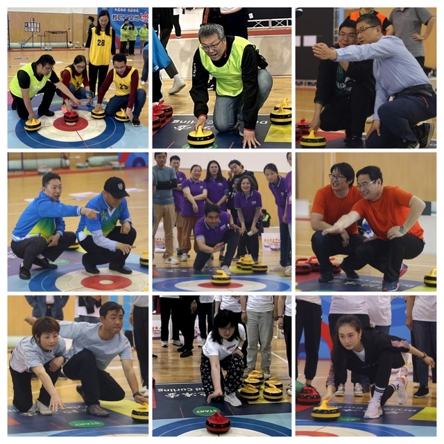 接着由邀请的专业教练带领全场教职工做赛前热身、专业培训,并介绍了比赛赛制和规则。而后各参赛队按照抽签结果分8片赛场进行实地体验,教职工对旱地冰壶运动从理论到实操层面,都得到了普及和提升。