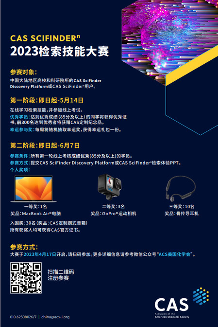 今年CAS SciFindern检索技能大赛将分两轮进行。在本场大赛第一轮中,所有用户可以系统学习CAS SciFinder Discovery Platform的检索基础、专题培训和应用案例。用户第一轮检索技能考核为客观题,每名用户均可参加,每位考核成绩优秀的学员都将获得CAS 颁发的第一轮获奖纸质证书;成绩优秀学员将进入第二轮考核,优胜者将赢得一、二、三等及入围奖,获颁大奖及第二轮大赛证书。具体安排如下: