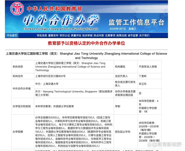 其中,上海交通大学张江国际理工学院由上海交通大学与新加坡南洋理工大学合作举办。学院将于2026年招收本科生750人,总办学规模为5000人。