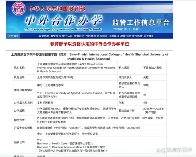 根据教育部中外合作办学监管工作信息平台公布的最新“教育部审批和复核的机构及项目名单”,教育部正式批准在上海设立两所中外合作办学机构——上海交通大学张江国际理工学院和上海健康医学院中芬国际健康学院,两所学院将于2026年启动首届招生。澎湃新闻记者1月7日也从校方确认了上述消息。