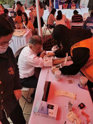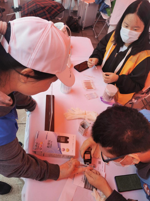 公卫健康义诊志愿服务团队为市民们进行健康义诊,在志愿过程中,志愿者给大家测量血压和血糖,并耐心讲解测量时的注意事项,了解市民生活习惯,分析其血压血糖情况,并给予相关建议,以此提高大家对高血压高血糖的防治意识,培养健康的生活习惯。