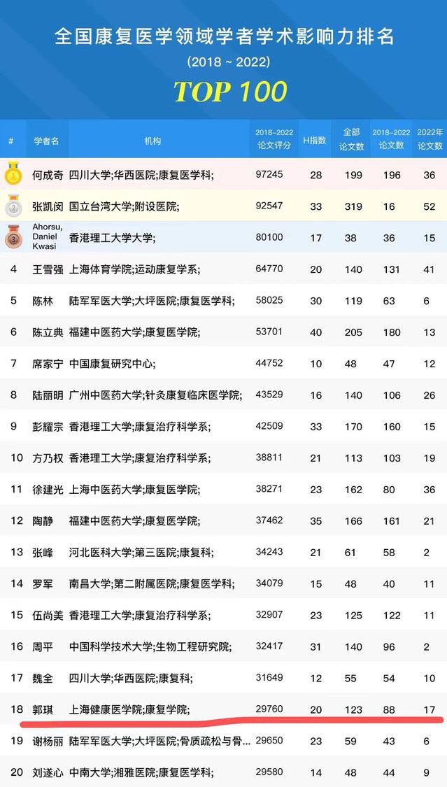 郭琪:教授,2019年引进为康复学院院长,2023年全国康复医学领域学者学术影响力百强排名第18位。