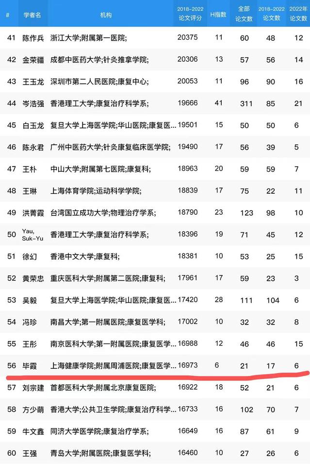 毕霞:主任医师,康复学院副院长,2018年作为高层次人才引进到上海健康医学院附属周浦医院康复科主任,2023年全国康复医学领域学者学术影响力百强排名第56位。