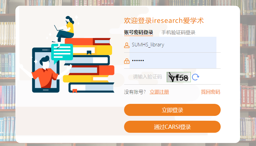 试用方式:可直接访问链接https://www.iresearchbook.cn或者图书馆门户网站数字资源选择试用数据库“爱学术Iresearch电子书库”,进入数据库首页后点击右上角登录,输入验证码后立即登录。