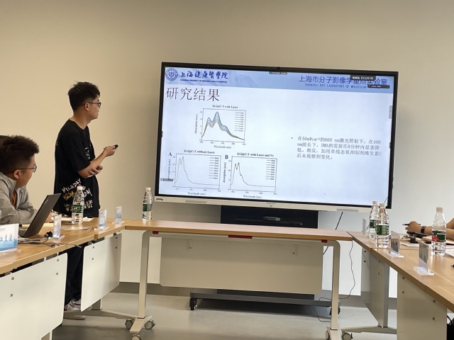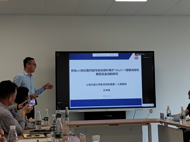 各开放课题负责人依次就课题进行了汇报。上海市第十人民医院余飞教授团队的张涵博士汇报了《D-SPECT的临床应用价值》、上海理工大学李钰皓教授汇报了《可降解铋材料在肿瘤诊疗中的应用》、华东理工大学的张伟安教授汇报了《近红外卟啉高分子材料的构建及其在光动力抗癌治疗中的应用》、复旦大学附属中山医院的江立波教授团队的王犇博士汇报了《离子液体修饰的纳米粒子通过核靶向光动力治疗脊柱转移瘤》、上海市第一人民医院的王中领教授汇报了《新型pH响应荷载阿霉素的磁性纳米探针用于磁共振引导聚焦超声刀增敏消融乳腺癌及监测的研究》、复旦大学附属华山医院的李明教授汇报了《靶向EGFR VⅢ突变的小分子肽的开发及可视化胶质瘤的临床前研究》。