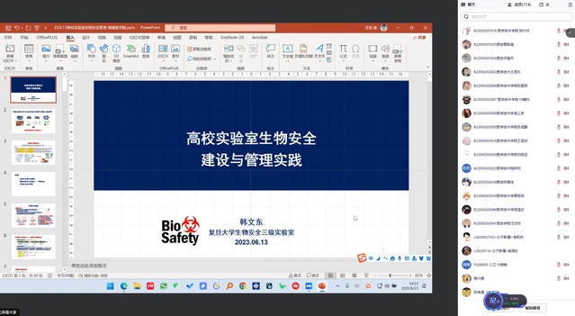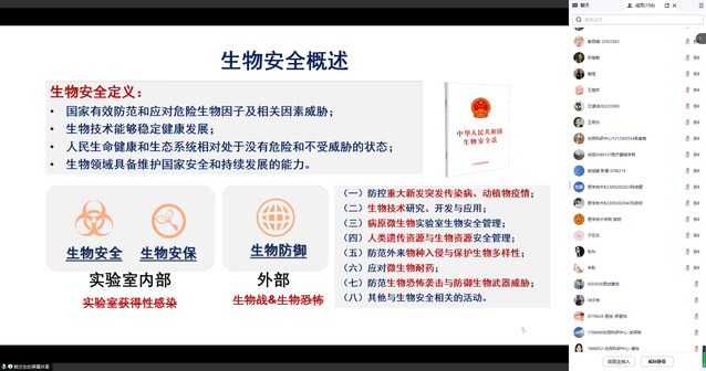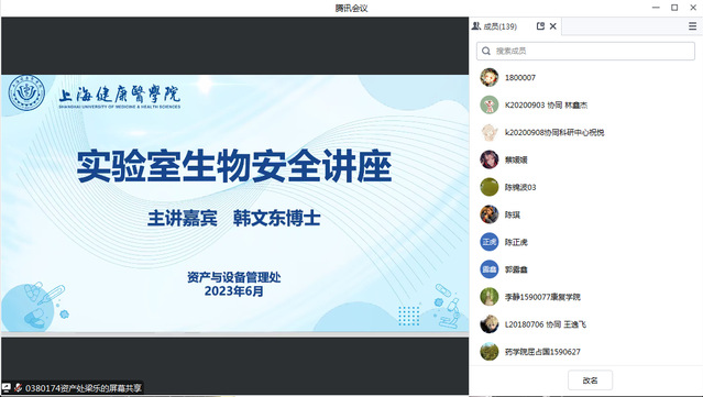为进一步提高我校师生的实验室生物安全意识和个人防护能力,保障教学、科研环境和校园的安全稳定,6月13日下午,资产与设备管理处特邀复旦大学ABSL-3实验室设施系统技术负责人韩文东博士为我校师生作了一场实验室生物安全线上讲座。各二级学院(部、中心)分管实验室安全院长、学院实验室管理人员、从事教学科研实验工作人员、职能部门负责人和师生代表180余人参会,资产与设备管理处邢寰宇副处长主持会议。