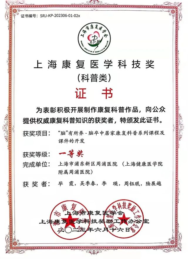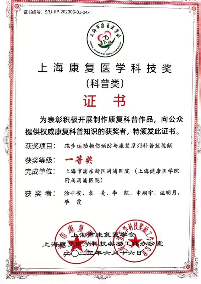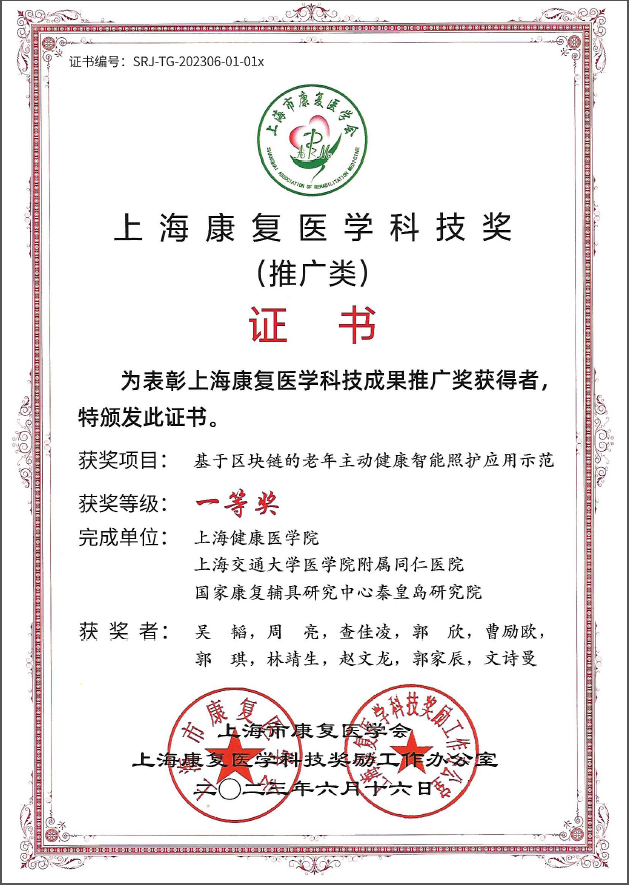 大会还表彰了一批在康复领域医学研究、技术创新、多学科融合发展等做出突出贡献的个人和组织,我校共荣获上海康复医学科技奖3项,校长吴韬研究员《基于区块链的老年主动健康智能照护应用示范》获上海康复医学科技奖(推广类)一等奖,附属周浦医院副院长涂平安副主任医师《跑步运动损伤预防与康复系列科普短视频》及康复学院副院长兼附属周浦医院康复科主任毕霞教授《“脑”有所养-脑卒中居家康复科普系列课程及课件的开发》获上海康复医学科技奖(科普类)一等奖。