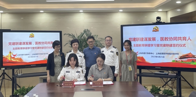 会上,上海市医疗急救中心科室第一党支部书记王娟和上海健康医学院临床医学院党总支第二党支部书记施毓玲分别代表上海市医疗急救中心和临床医学院签署了党建联建协议。
