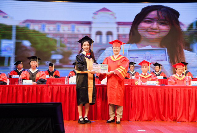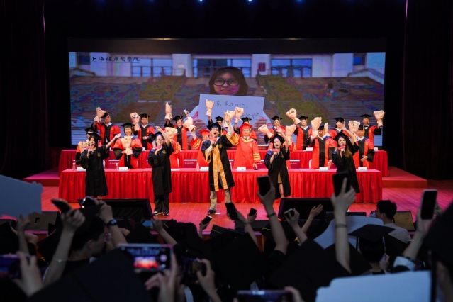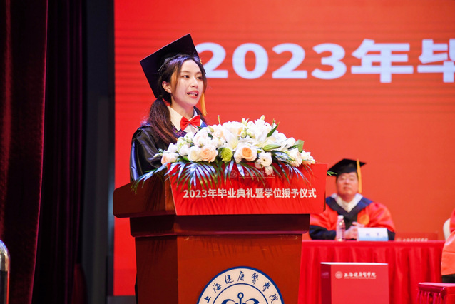 毕业典礼上,唐红梅宣读2023年度上海市优秀毕业生、校级优秀毕业生以及校长荣誉学位获得者名单,台上领导为优秀毕业生代表颁奖。吴韬校长为21名校长荣誉学位获得者颁奖。所有付出的努力在此刻被铭记。