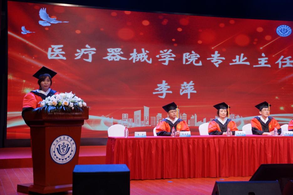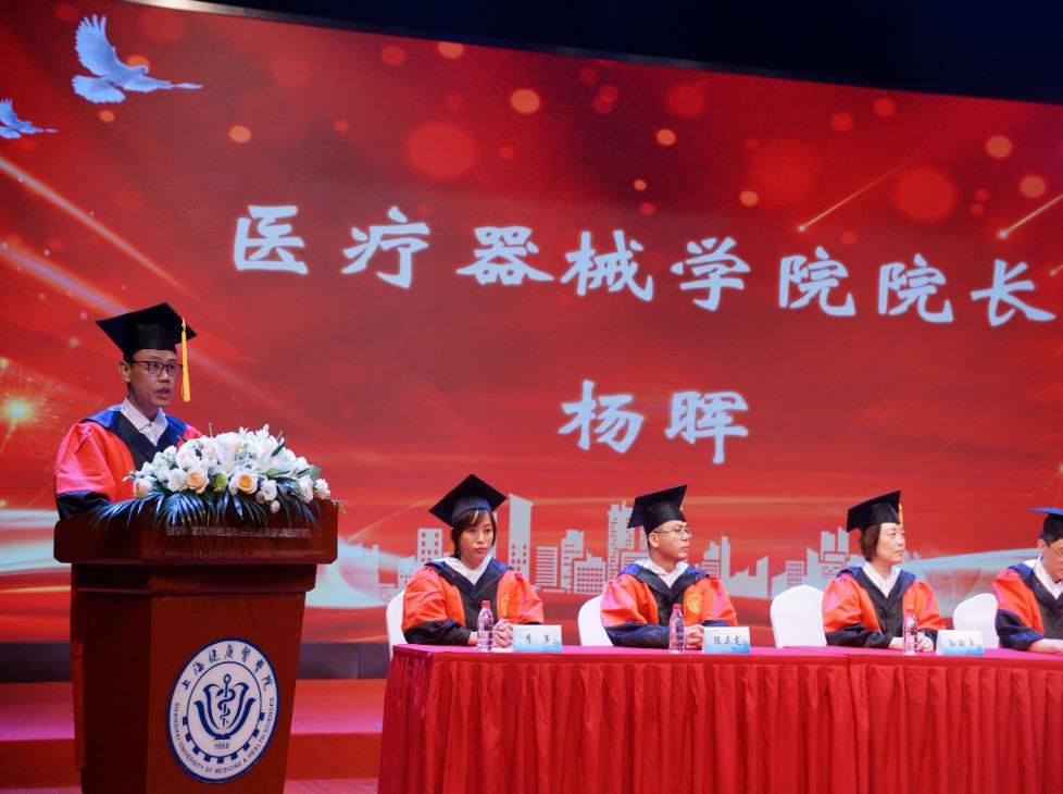 医疗器械学院院长杨晖代表学院向圆满完成本科学业的同学们表示热烈的祝贺,向悉心培养他们的老师表示衷心的感谢,向每一位关心帮助他们的家人朋友,致以最诚挚的谢意和崇高的敬意。杨晖表示,医疗器械学院一直享有“医疗器械工程师的黄埔军校”的美誉,学院以“产教融合、医工结合、国际合作”为特色,聚焦生物医药产业,致力于培养医疗器械研发维护、临床应用、医疗产品管理、医疗大数据等领域高素质应用型人才。一代又一代医械学子怀揣梦想,笃定前行,在祖国和人民最需要的地方放飞青春梦想,展现青春担当。随后送上了他的希望与祝福。他希望同学们应铭记械者初心,不负青春韶华。只有将个人的价值追求与祖国的命运紧密联系在一起,才能避免在各种诱惑中不迷失自己的信仰;希望同学们应追求械者匠心,锤炼工匠精神。在面对复杂的机械工程原理,多变的临床情况,枯燥乏味的生物实验、单调重复的数据检索、不断更新的器械管理条例,数以万计的医疗大数据,一定要锲而不舍,持之以恒;希望同学们应永怀医者仁心,做一个受人尊敬、令人温暖、对社会有益的人,用实际行动为祖国医药卫生事业的发展和人类身心健康奋斗终生!