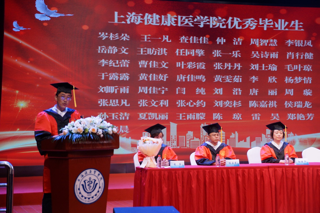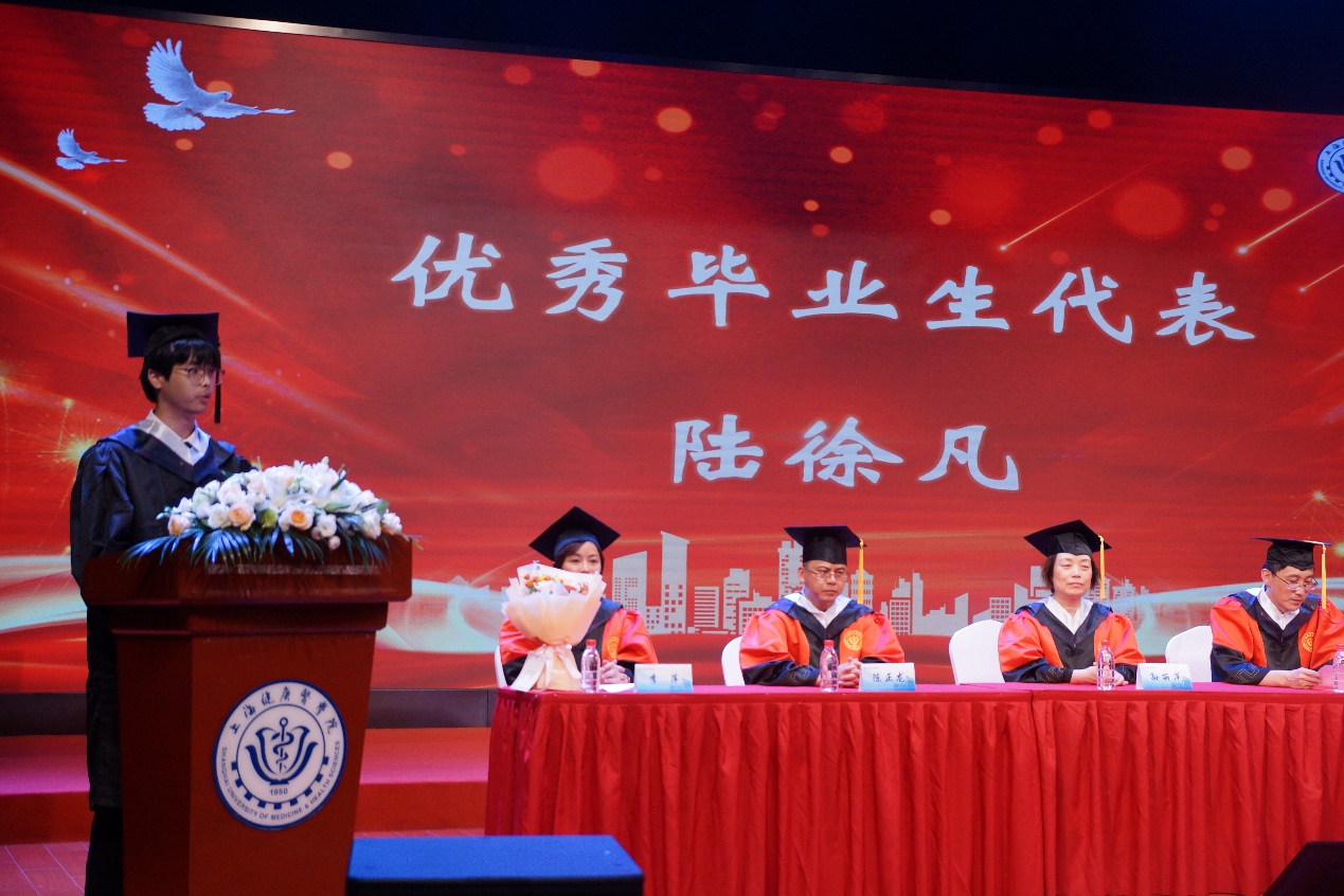 2023届上海市优秀毕业生陆徐凡作为学生代表发言。他分享了自己四年大学时光,无数个第一次尝试最终成就了他目前取得的成绩,他讲到“厚德至善,健行康民”的校训深深烙印在每一代健康学子的心里,激励同学们在追求真理的道路上阔步前行,新时代青年要积极投身于未来医疗卫生事业中,真正做到无愧于“健康所系,性命相托”这八个字。最后,他代表2023届毕业生祝愿母校的明天更加美好,也向在场同学们致以诚挚的毕业祝福。