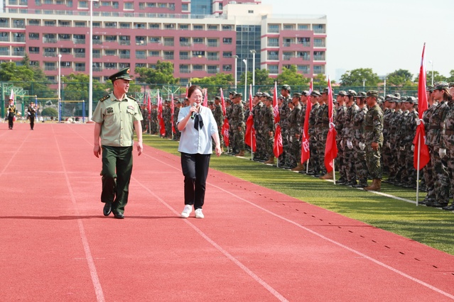 军训结营汇报在冉冉升起的五星红旗与庄严的国歌声中拉开帷幕。在迎团旗仪式后,郭永瑾书记在张国龙副参谋长的陪同下,对各班级连队进行了检阅。“同学们好~,老师好~”,“同学们辛苦了~,为校争光~”,同学们精神饱满,斗志昂扬,口号响彻天空。