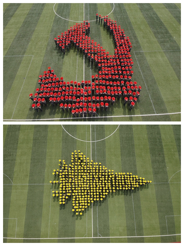 最后上场的是由400位同学组成的队列操方队,他们以“祝福校园致敬青春;铭记历史爱党爱国;伟大的中国航天”三个篇章为我们带来精彩绝伦的表演。通过展示校训“厚德至善,健行康民”、国旗、党徽、航天器等多种造型,彰显新一代健康人的时代风貌,传递了强国有我的铮铮誓言!