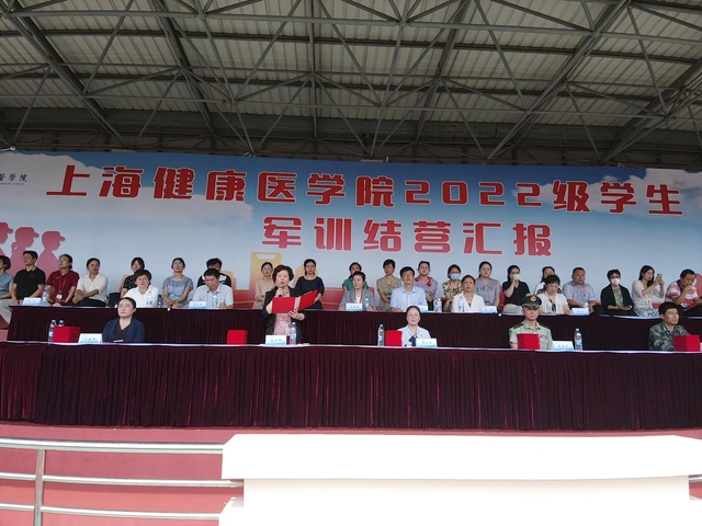 7月7日上午,上海健康医学院2022级学生军训结营仪式暨汇报展演在北苑操场隆重举行。武警上海总队机动一支队副参谋长张国龙,校党委书记郭永瑾,校党委副书记、副校长唐红梅出席仪式。各学院党总支书记、副书记、辅导员,相关职能部门负责人,军训教官和2022级全体学生参加本次汇报展演,仪式由学工部、武装部部长吕晓丽主持。