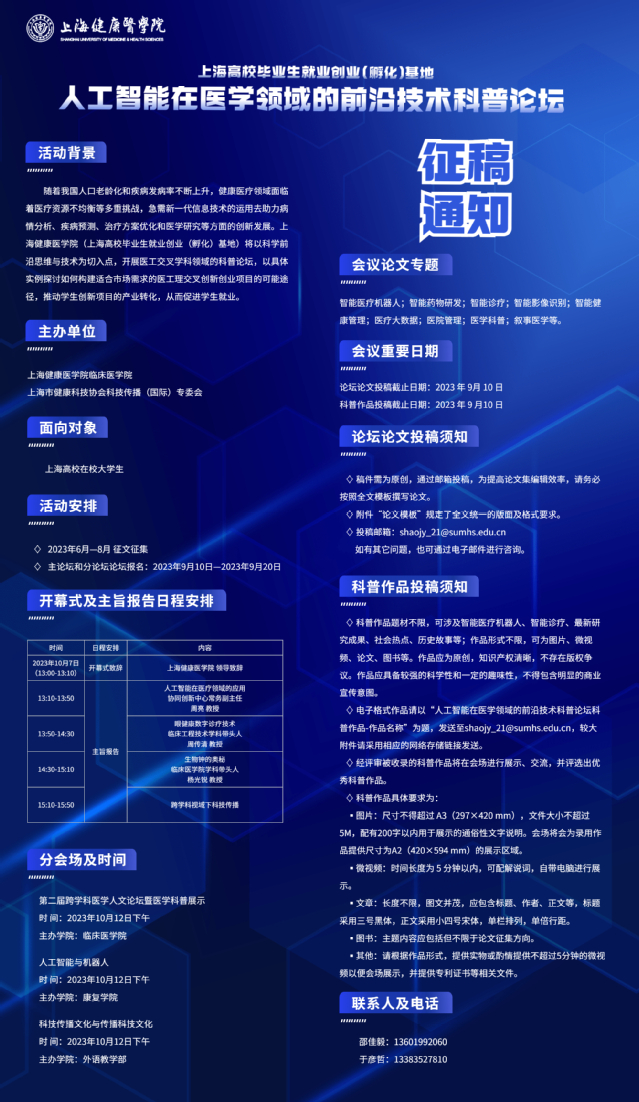 人工智能在医学领域的前沿技术科普论坛征稿通知