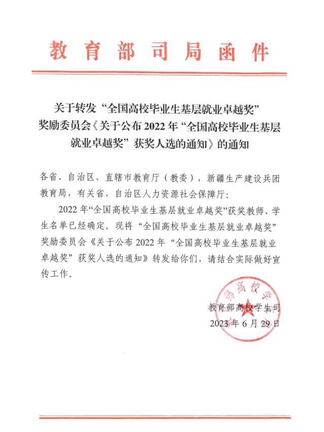 “全国高校毕业生基层就业卓越奖”是由教育部高校学生司、教育部学生服务与素质发展中心共同指导,中国长江三峡集团出资,中国教育发展基金会设立,旨在学习贯彻习近平新时代中国特色社会主义思想和习近平总书记对高校毕业生的重要回信精神,落实党中央、国务院关于引导和鼓励高校毕业生到基层就业的决策部署,奖励赴基层就业并作出突出业绩的普通高校毕业生和普通高校就业指导服务大学生赴基层就业工作有突出贡献的教师。2023年1月,教育部部署各地各高校开展“全国高校毕业生基层就业卓越奖”推荐活动,经各省(市、自治区)评选推荐,从全国2700余所普通高校中确定奖励毕业生398人,上海市共计9人。