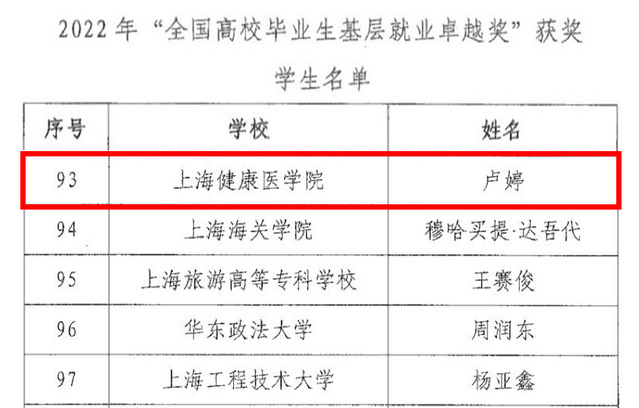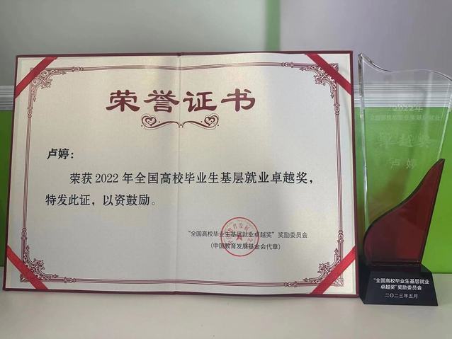 近日,中国教育发展基金会公布了2022年“全国高校毕业生基层就业卓越奖”获奖人选名单,我校经过评选推荐的2014届临床医学专业毕业生卢婷获此殊荣。