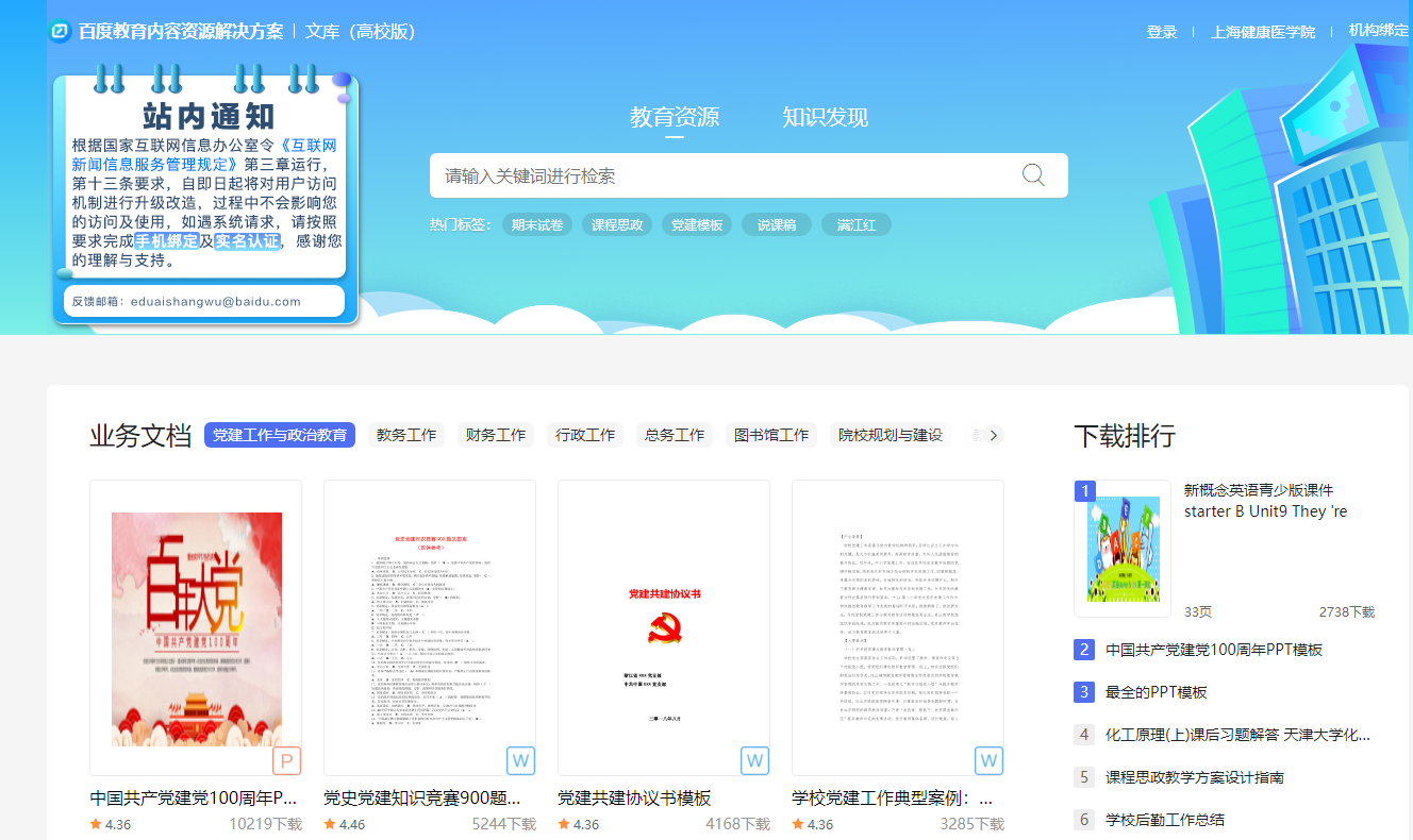 “百度文库高校版”( https://eduai.baidu.com)是百度文库为高校机构用户打造的数字资源服务平台,基于多年沉淀的海量用户大数据与高校实际用户需求场景结合,通过知识图谱挂载的能力从文库海量数字内容中提取出高质量的专业实用数字资源放到平台当中,将内容按照基础课、工学、理学、管理学、医学、农学、法学、经济学、艺术学、文学、教育学、哲学和历史学这12个一级学科的大分类,92个二级学科的次分类,再到504个专业,乃至专业之中7590门课程的精细划分进行展示,与高校课程高度同步、精细匹配,满足高校场景下的数字资源使用需求。