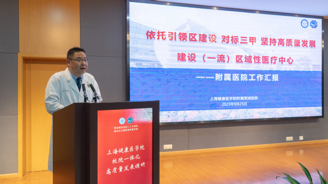 在调研交流会上,林研围绕直属附属医院建设发展,对标三级甲等医院标准,从医院近期情况、医校融合发展和未来展望三个方面作了详细汇报。自2017年成为上海健康医学院附属医院以来,得到医学院给予的大力支持,2022年获批成为上海健康医学院直属附属医院,进一步深化融合探索创新,加快构建具有院校一体化特色优势的直属附属医院管理新模式,聚焦重点学科建设,促进医、教、研、管协同的医学教育高质量发展。