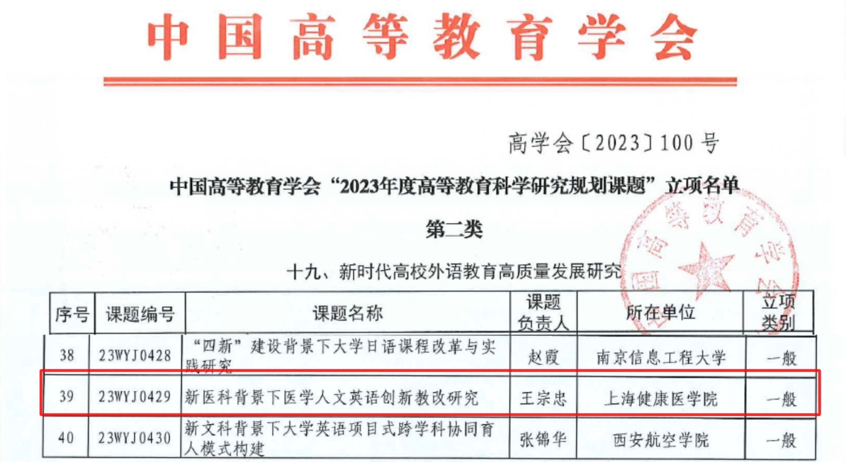 9月27日,中国高等教育学会公布了“2023年度高等教育科学研究规划课题”立项名单,外语教学部王宗忠教师团队主持申报的课题“新医科背景下医学人文英语创新教改研究”成功获批立项。